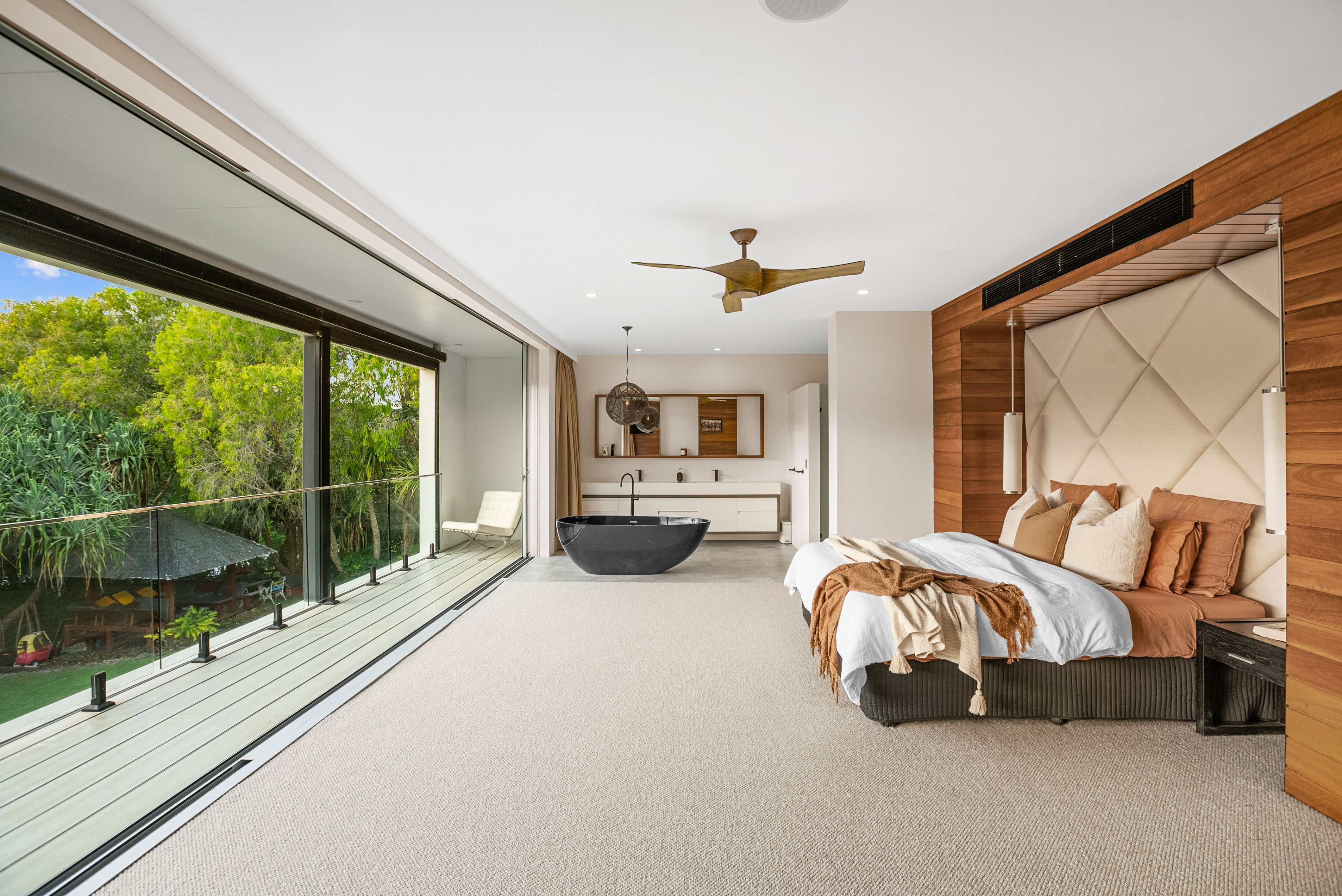 Master Suit- King Bed. The Main Master Suite proudly offers a king-size bed coupled with an ensuite, freestanding bath with the view for your privacy and comfort. It is perfect for those who enjoy a touch of luxury.